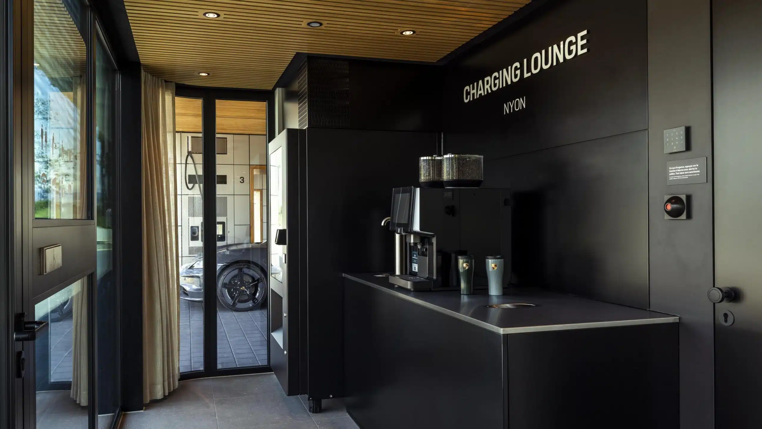 Outside, bench seating areas equipped with built-in speakers reflect the level of comfort on offer. And to make the charging break more enjoyable, the interior spaces offer a range of services for users: comfortable lounge chairs, a varied selection of cold drinks and snacks, a coffee machine, a water dispenser and modern restrooms, not to mention high-performance Wi-Fi.