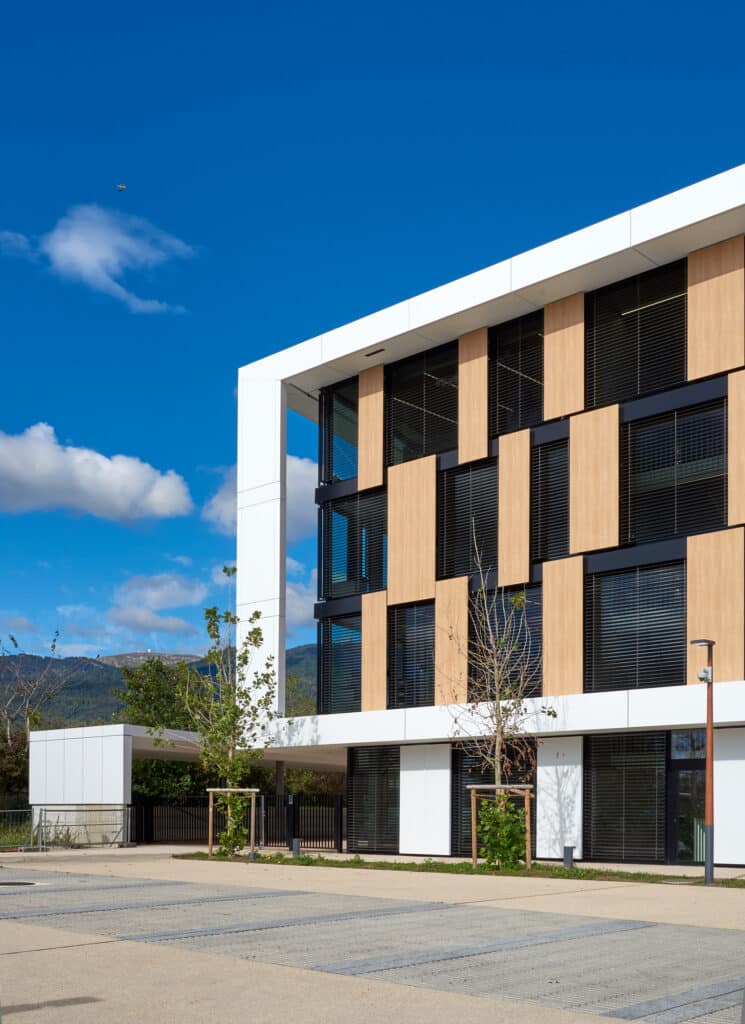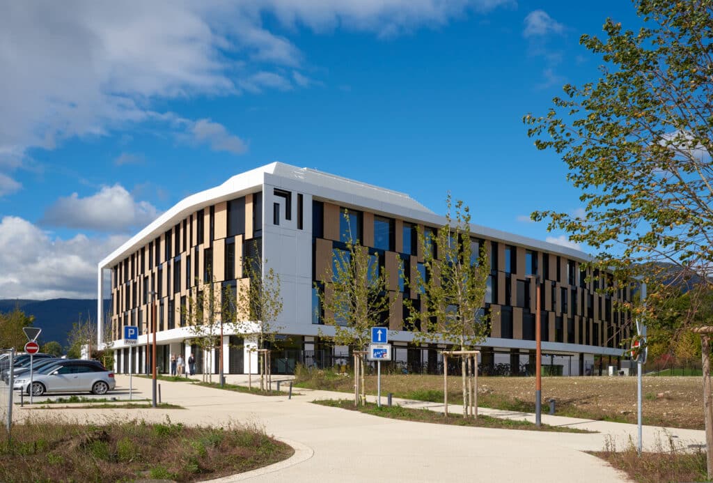 La façade vitrée du bâtiment permet aux élèves et aux professeurs de profiter d’une ouverture sur l’extérieur et de l’environnement qualitatif dans lequel le bâtiment est implanté : proximité avec le Jura, vue sur le Mont blanc et sur le lac Léman, champs avoisinants.